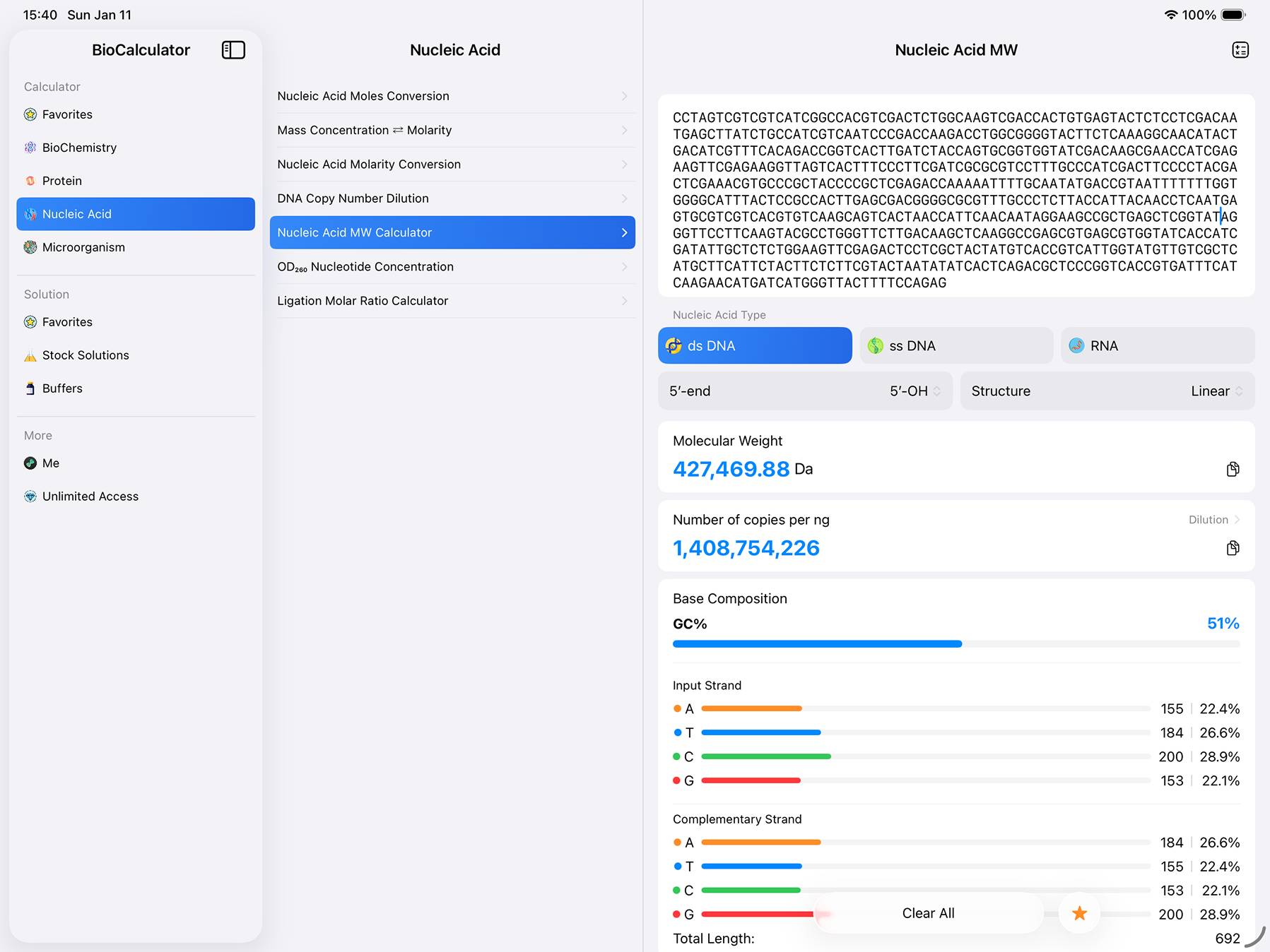 Various nucleic acid-related calculations with customizable molecular weight calculation methods.