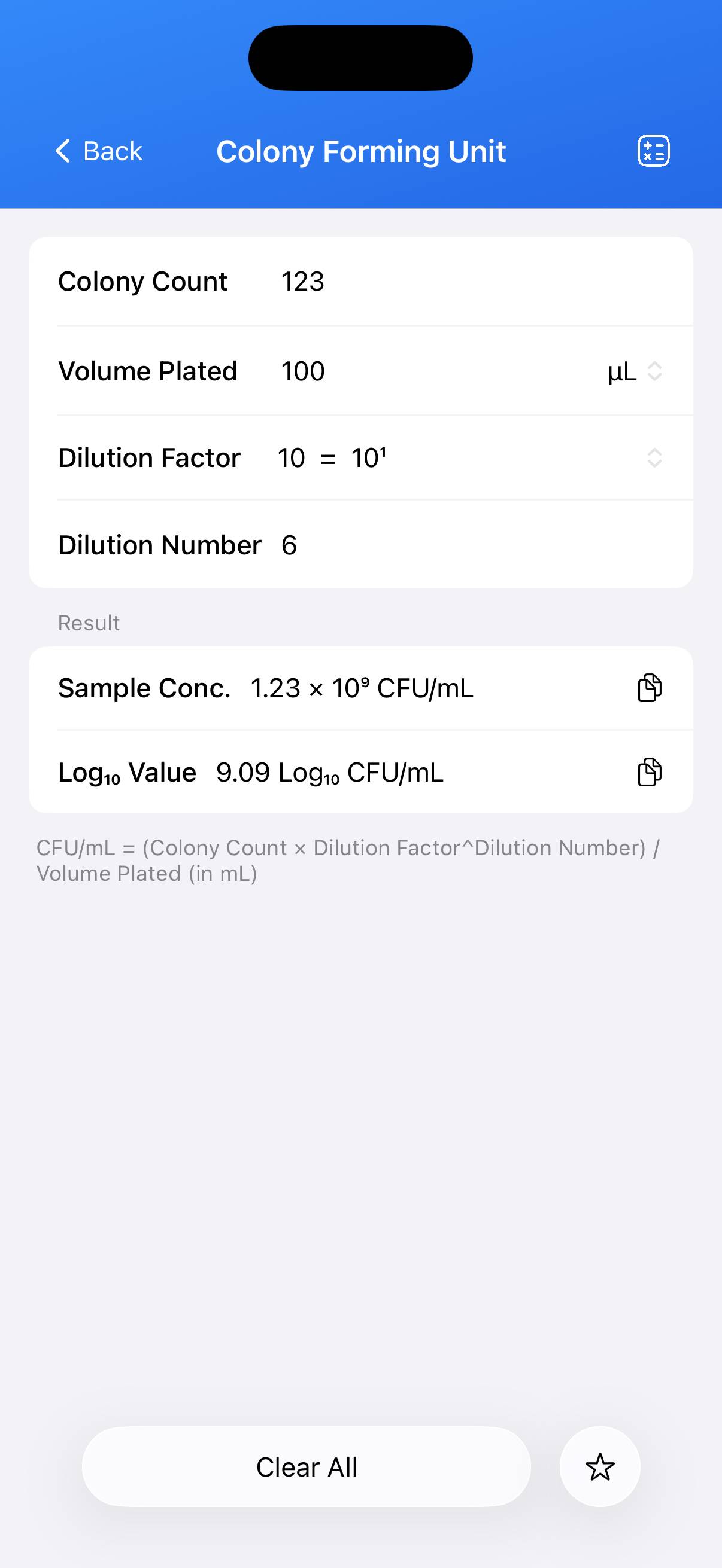 This tool accurately determines the concentration of viable microorganisms in your original sample based on colony counts, plated volume, and dilution factor.