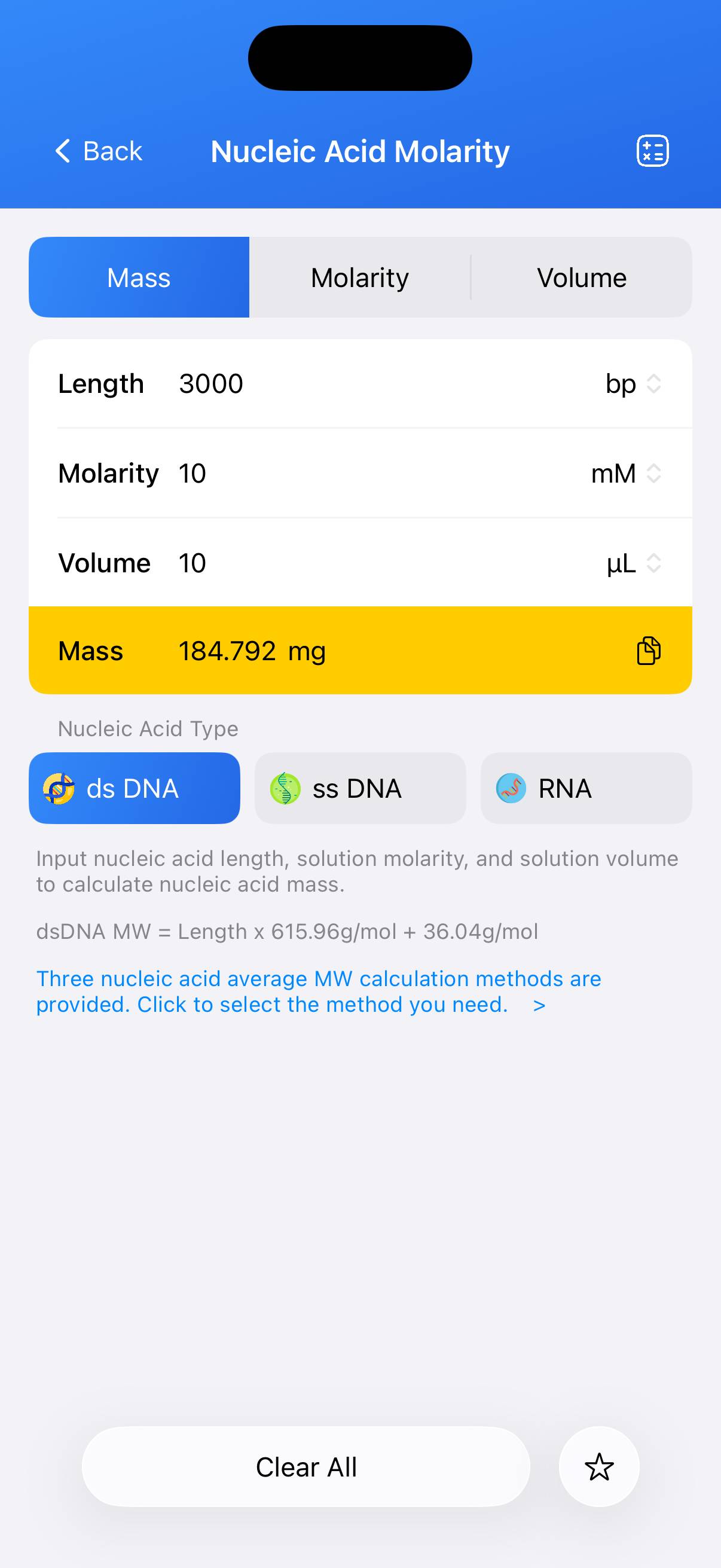 To accommodate different experimental conventions, the tool provides three commonly used methods for calculating nucleic acid molecular weight. Users may freely select the method that best fits their workflow.