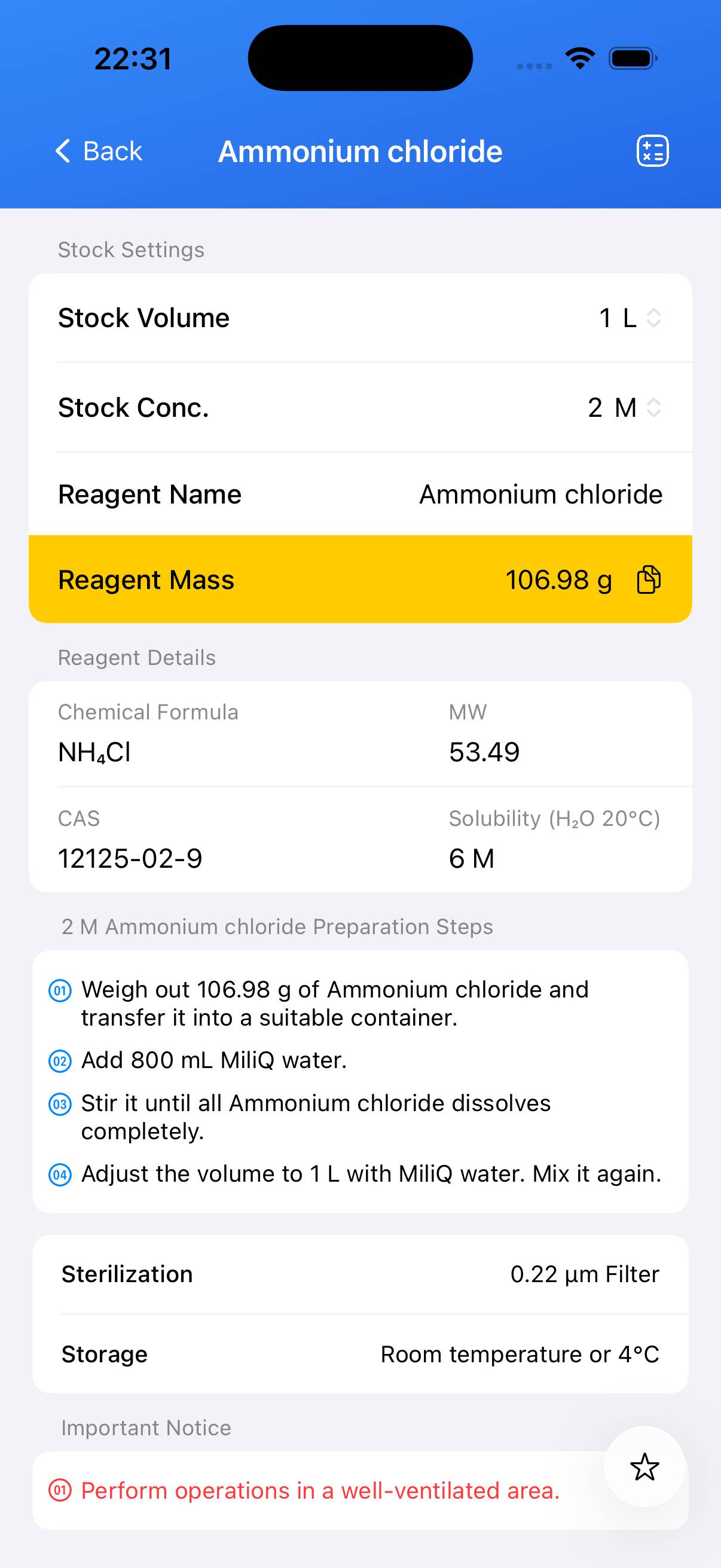 Aqueous NH₄Cl stock solutions can be filtered through a 0.22 µm membrane for sterilization if required for biological applications. Solutions are typically stable at 4 °C for several weeks; for long‑term storage, aliquot and freeze at −20 °C to avoid contamination.
