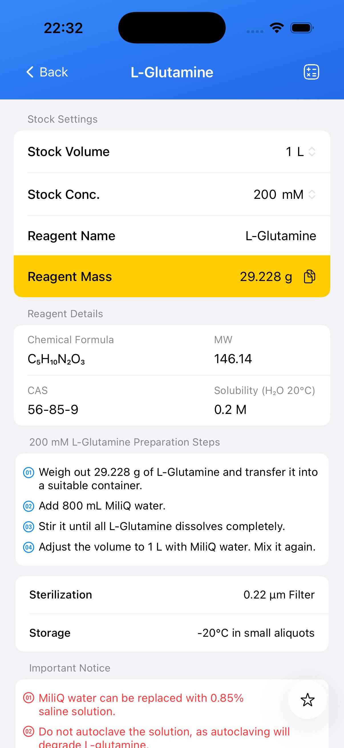 - 200 mM L‑Glutamine (C5H10N2O3) solution in cell culture grade water or 0.85% saline