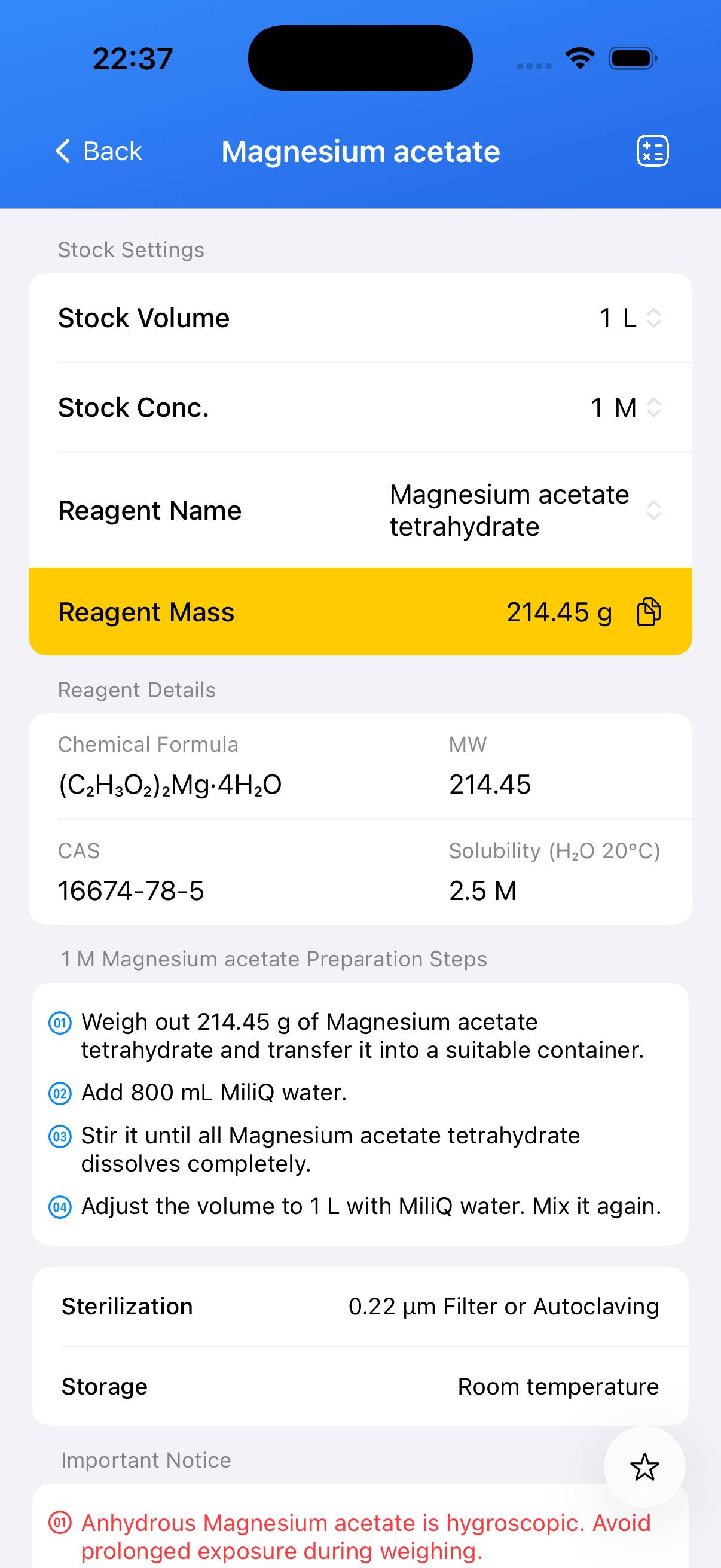 Determine the required mass for the target molarity. For a 1 M stock solution using **magnesium acetate tetrahydrate (MW ≈ 214.45)**: weigh **214.45 g** for 1 L. Scale proportionally for other volumes (e.g., 21.445 g for 100 mL). - Step 2