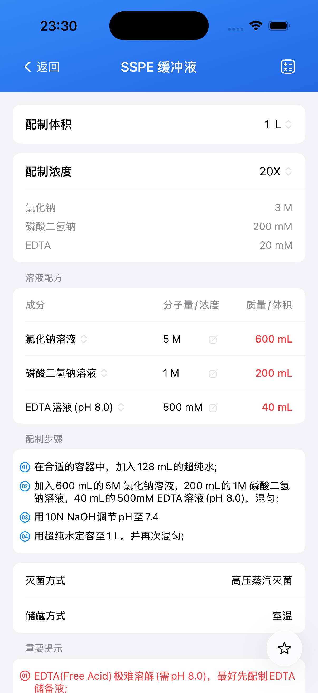 - EDTA(游离酸)极难溶解,最好先配制EDTA储备液。