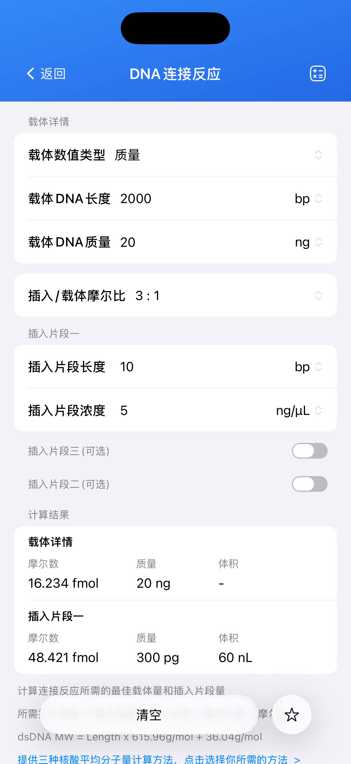 本工具专为分子克隆实验设计,可根据载体 DNA 用量和设定的插入片段与载体的摩尔比例, 精确计算所需插入 DNA 的用量,并生成完整的连接反应配置方案。