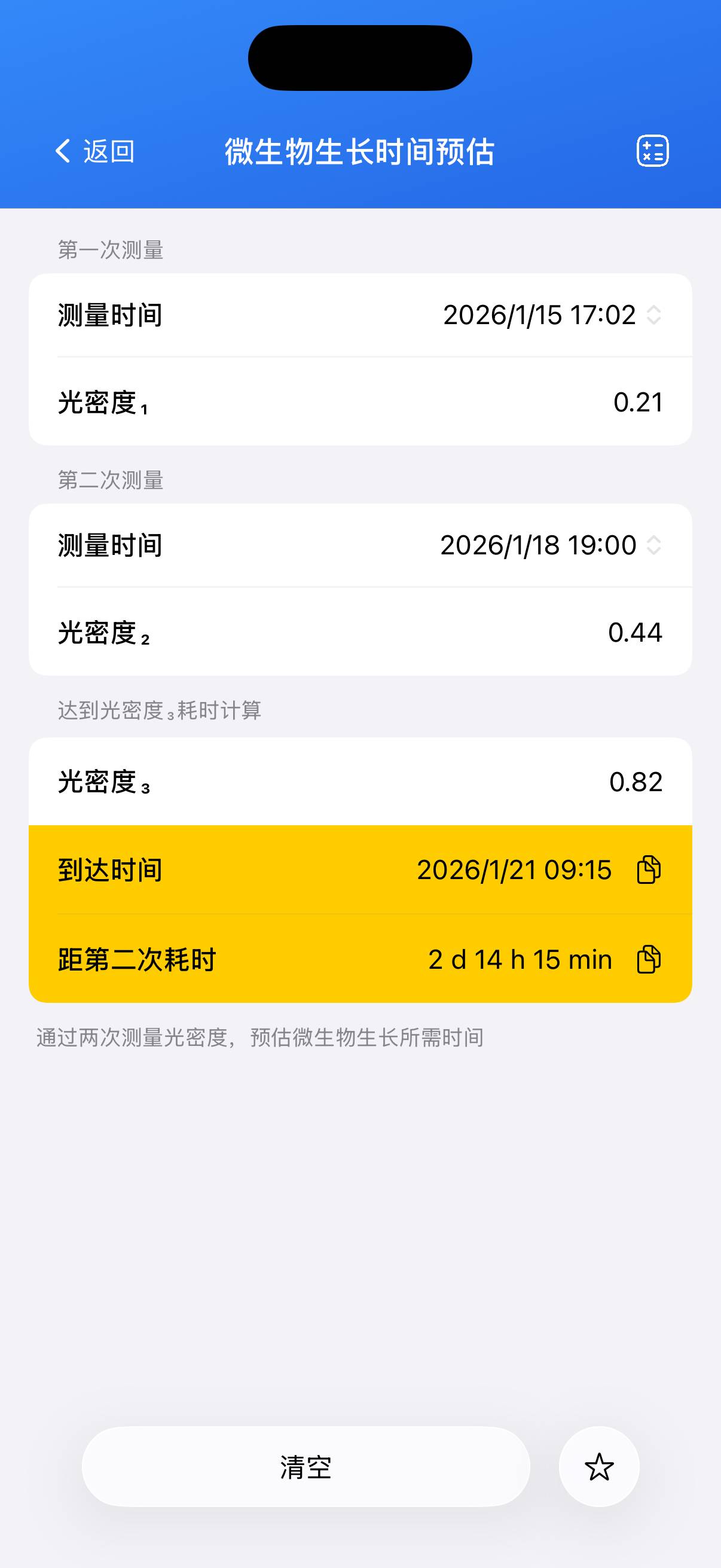 本工具可根据两次细菌培养液的 OD260 测量值,预估细菌生长达到目标浓度所需的时间。