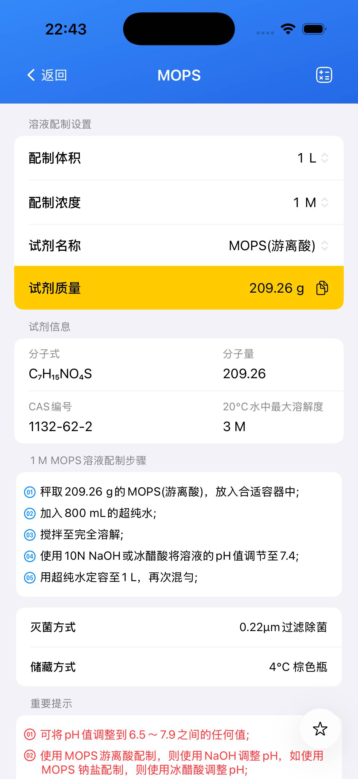 配制 500 mL 1 M MOPS 缓冲液(pH 7.4)储备溶液。