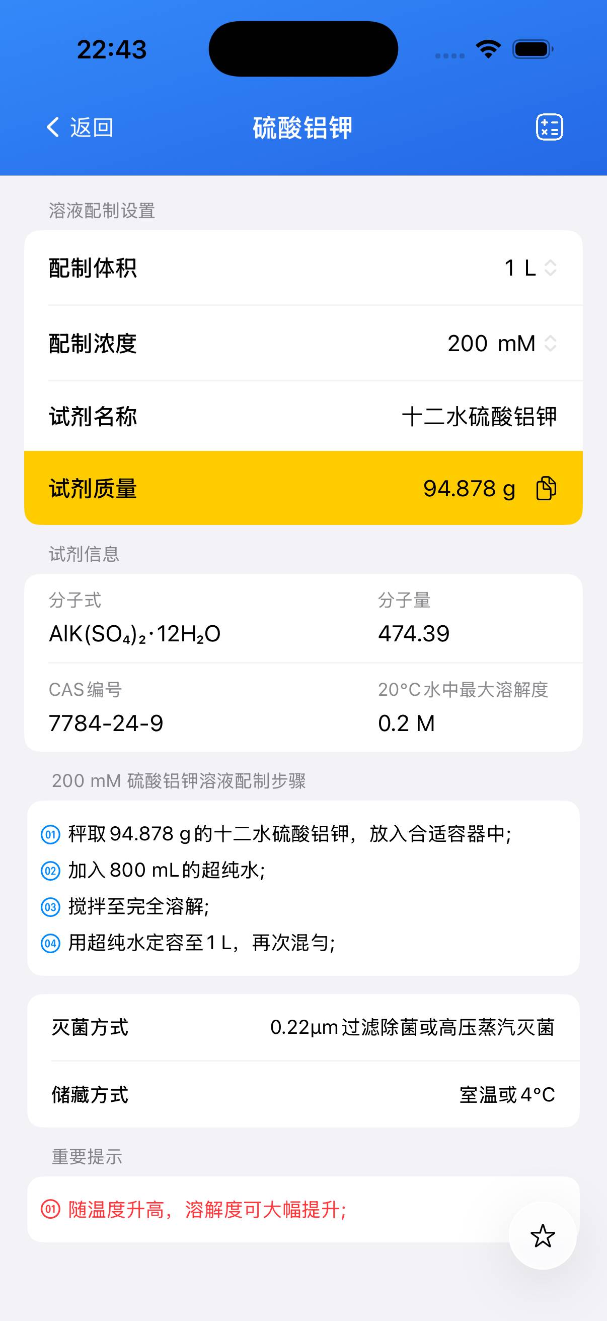 确定目标浓度。配制 1 M 溶液时,称取 **474.39 g** 十二水硫酸铝钾用于 **1 L** 总体积;如配制 100 mL,则按比例取 **47.439 g**。 - 步骤2