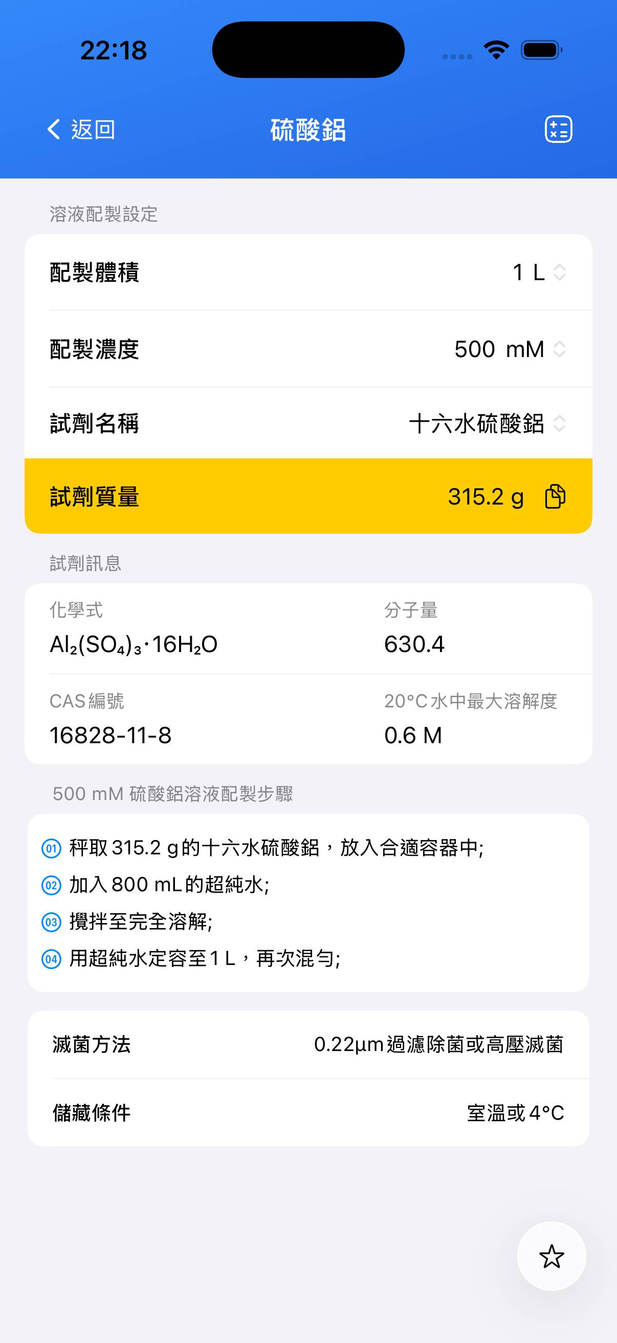 注意:水合鹽更適合準確稱量;無水硫酸鋁易吸濕,不利於準確配製。完成後請在容器清晰標註濃度與日期並密封保存。