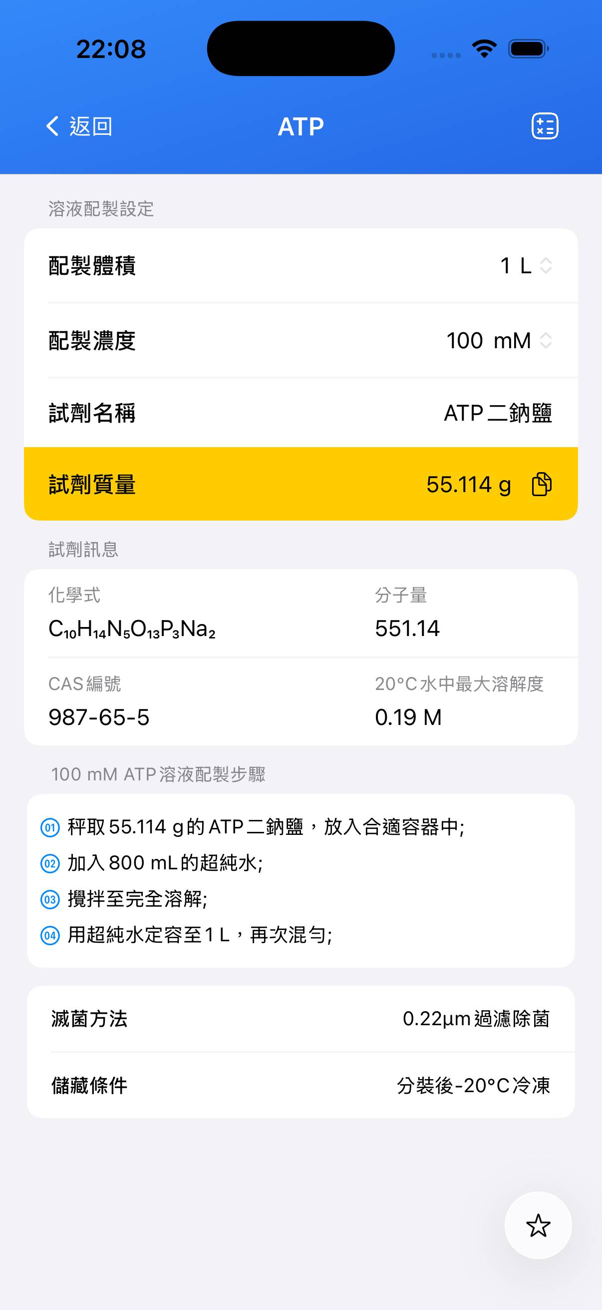 • 稱取 55.115 g ATP 二鈉鹽。